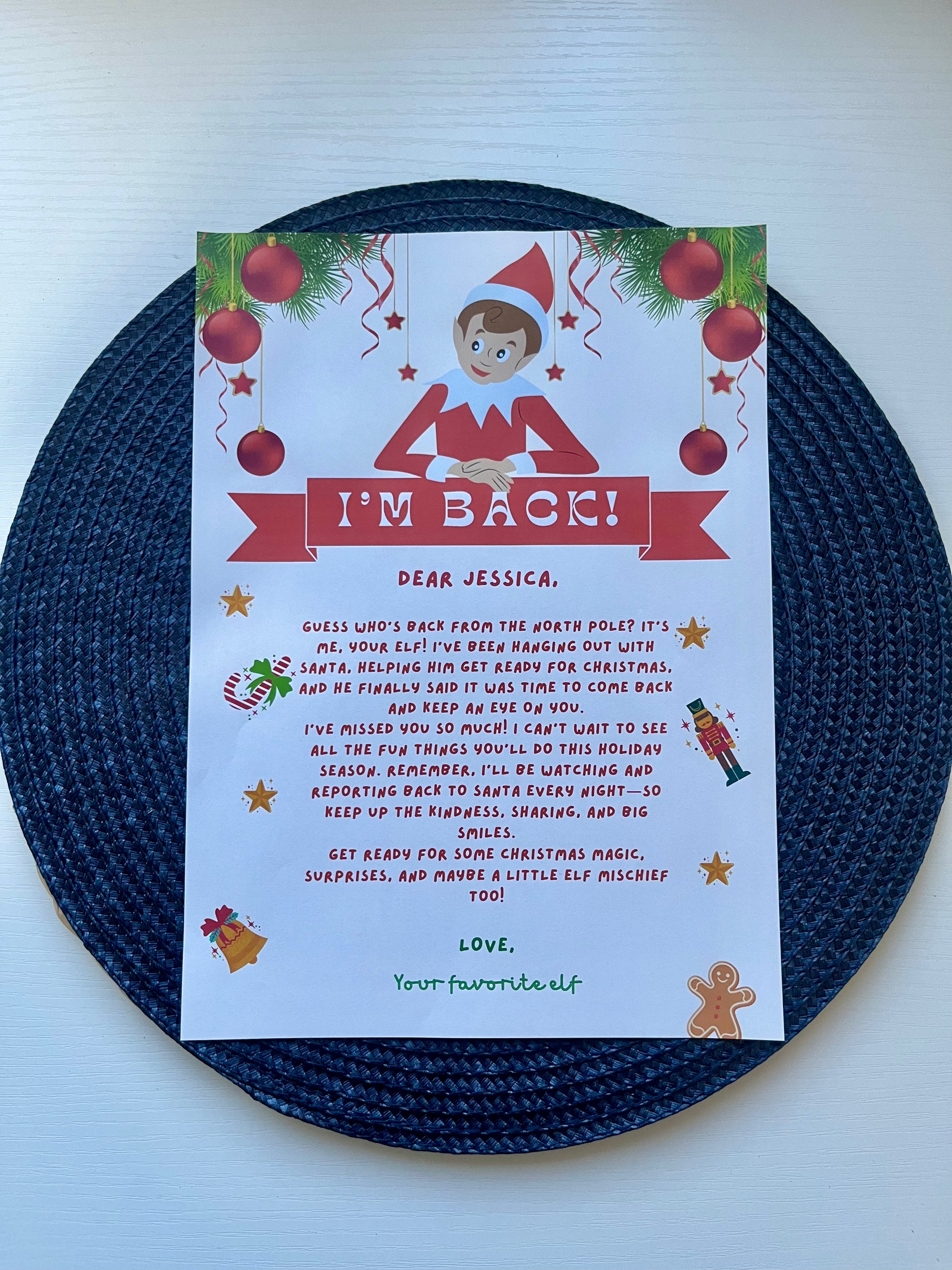 Welcome your child's cherished elf companion back with this personalised letter from the North Pole. Each bespoke design features your child's name, creating an authentic keepsake that reinforces the festive narrative. The letter serves as a tangible connection to Christmas traditions, encouraging imaginative play and seasonal anticipation. Display it proudly or preserve it as a treasured memento of childhood wonder. An expertly crafted addition to any Christmas celebration.